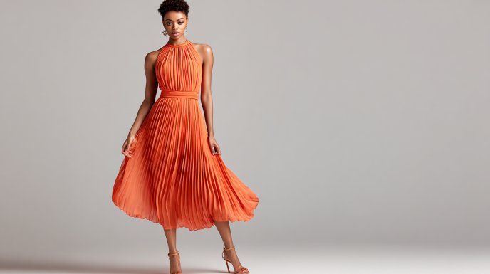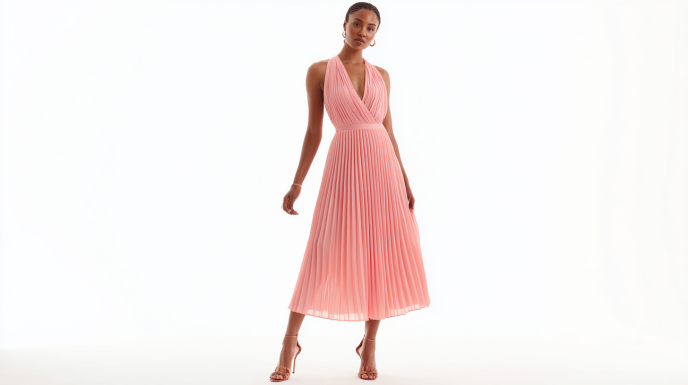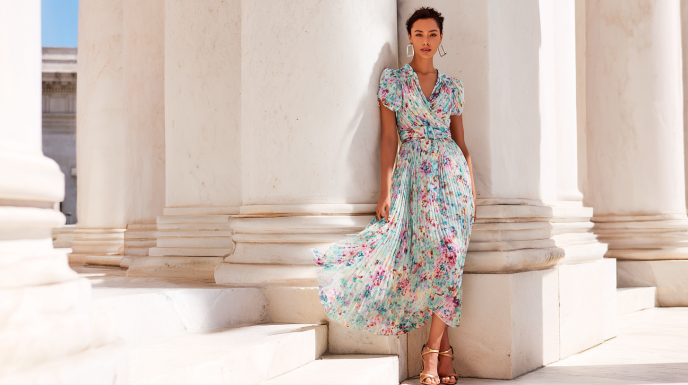 For a wedding or garden party, let the print lead. Add strappy heeled sandals in tan or gold, a small structured clutch in a warm neutral, and a few pieces of simple gold jewelry. The dress’s festive energy does the heavy lifting — your accessories just need to complement it without competing.