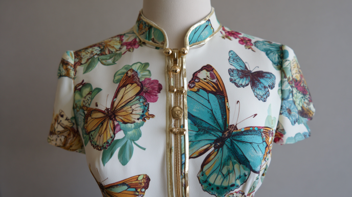 The butterfly motif itself carries considerable symbolic and aesthetic weight in the domain of fashion semiotics. Historically associated with transformation, delicacy, and the natural feminine archetype, the butterfly has been employed across couture and ready-to-wear collections as a device for communicating both structural ingenuity and thematic depth. In the case of Antonio Melani’s implementation, the motif achieves particular sophistication through the technique of three-dimensional embroidery executed on a tulle overlay — a construction method that requires substantially greater material investment and production complexity than flat-print or embossed alternatives. The resulting garment occupies a visual register closer to artisanal textile work than conventional commercial ready-to-wear.